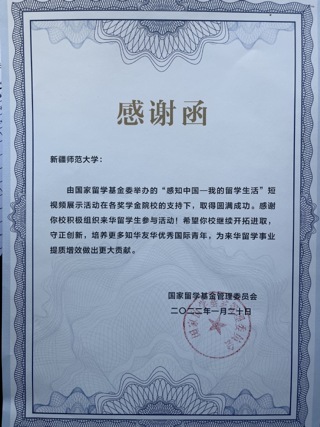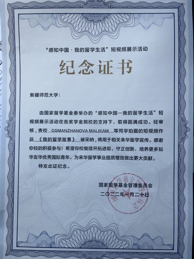 近日,国家留学基金委举办的“感知中国—我的留学生活”短视频展示活动结束评审工作,太阳成官网留学生OSMANZHANOVA MALIKAM所拍摄视频作品《我的留学故事》被采纳,国家留学基金管理委员会给太阳成官网发来纪念证书和感谢信,以表达对太阳成官网积极组织来华留学生参与活动的谢意。