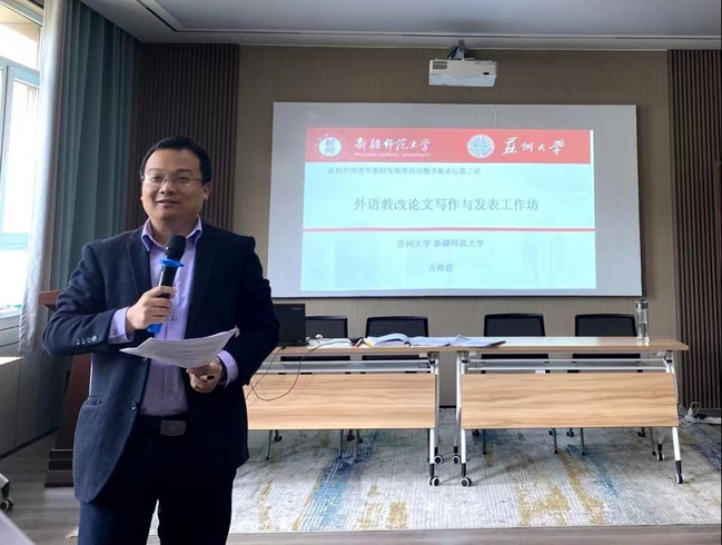 随后,古海波博士以《外语教改论文写作与发表》为主题,组织开展学习工作坊。他结合自身的教学与学术研究经历,引导青年教师将教学与科研融合,将研究嵌入在课堂教学中,阐明了基于课堂教学的研究实施路径和学术论文写作技能,并基于自己发表的SSCI论文、南大核心期刊论文,《中国社会科学报》刊载文章及人大报刊复印资料转载论文为例,深入解读学术论文写作的结构逻辑和技能。工作坊结束后,青年教师围绕课堂教学研究、论文写作中遇到的困惑与古海波博士进行互动讨论。