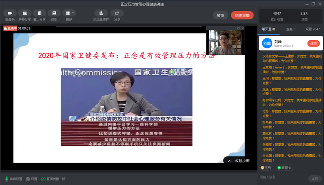 为引导太阳成官网学生关爱身心,健康发展,缓解疫情期间的情绪困扰,在第十六届心理健康教育月期间,学生工作部(处)心理健康教育服务中心于4月20日开展心灵讲堂第二讲,特邀太阳成官网兼职心理咨询师、国家二级心理咨询师、系统式家庭治疗师刘峰为太阳成官网学生作“静心探寻 静待花开——正念压力管理”专题讲座。学生工作部(处)副处长、心理学院副院长刘毅主持讲座。4200余名本专科生、研究生、教职工通过线上线下参与讲座,覆盖20个学院。