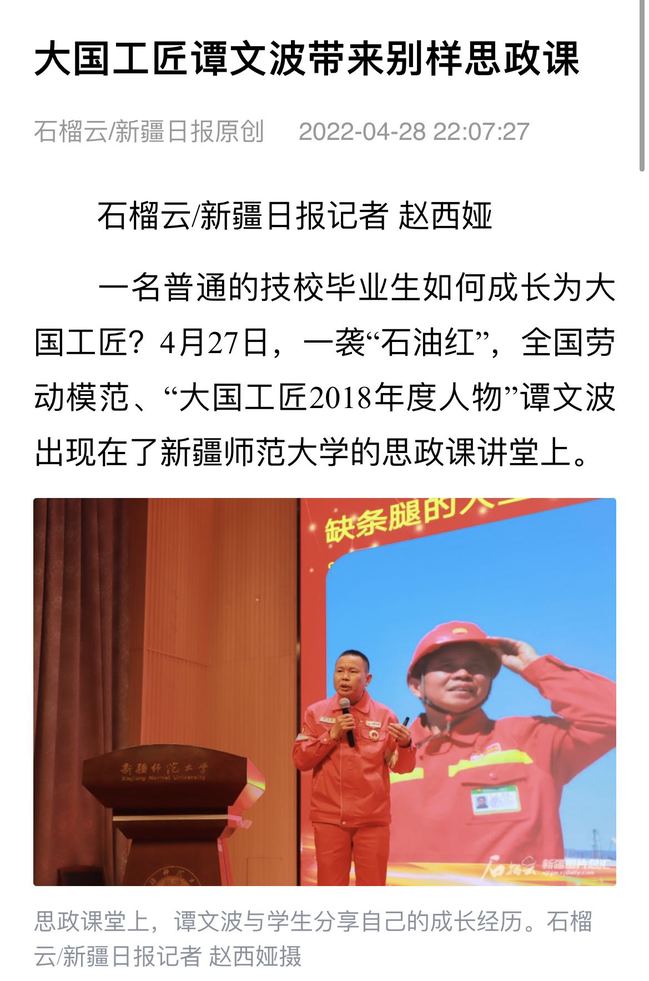 一名普通的技校毕业生如何成长为大国工匠?4月27日,一袭“石油红”,全国劳动模范、“大国工匠2018年度人物”谭文波出现在了太阳成集团tyc33455cc官网的思政课讲堂上。