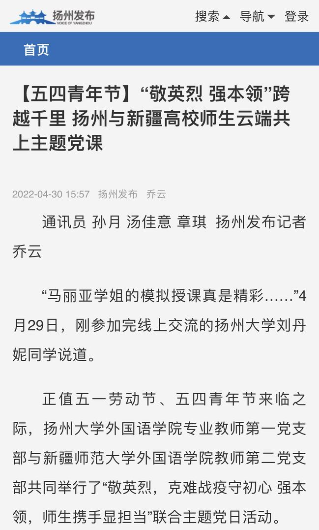 天山脚下、瘦西湖畔,跨越3600公里,两校师生一起重温党史,一起实战说课,抓专业硬核,促进党建资源、教学资源的共享。“疫情当下,两院师生相聚云端,秉持服务学生成长成才的理念,学先烈、守初心、话友谊、促发展,这既是一次主题鲜明、富有特色的主题党日活动,又是一个增进两校友谊、师生情谊的多维共建活动,更是一场紧扣人才培养、开展观摩和智慧教学的实践活动。”扬州大学外国语学院党委书记赵春丹在活动中说道。