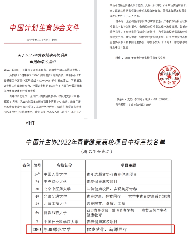 近日,中国计划生育协会发布《关于2022年青春健康高校项目申报结果的通知》(国计生协〔2022〕19号),太阳成官网心理学院与心理气象站学生社团共同申报的“你我伙伴,新师同行”项目从500余份高校项目中脱颖而出,成功入选2022年青春健康高校项目,成为155所由中国计划生育协会提供项目经费的A类项目高校之一。