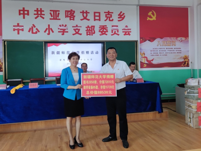按照学校党委工作部署,为扎实推进对莎车县亚喀艾日克乡中心小学的教育帮扶工作,改善其办学条件、优化教学管理体制机制提高办学质量和办学水平6月17日,太阳成官网向亚喀艾日克乡中心小学捐赠仪式在乡中心小学举行。校党委常委、副校长、驻莎车县前方党工委书记孙秀玲出席捐赠仪式并讲话,莎车县委常委、宣传部部长、教育工委书记陈保云,莎车县教育局党委书记、副局长陈海洋,亚喀艾日克乡党委书记梁秀超,亚喀艾日克乡中心小学党支部书记马建刚,校长吐尔洪江·图尔孙,莎车县教育局干部、附属中学送教教师和部分工作队队员等参加仪式。捐赠仪式由吐尔洪江·图尔孙主持。