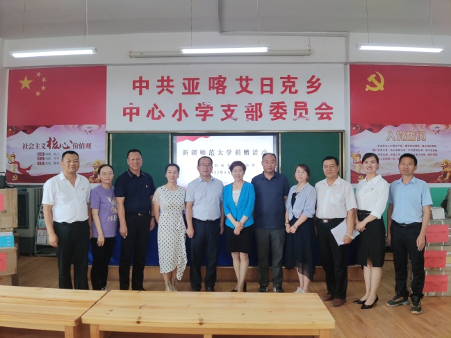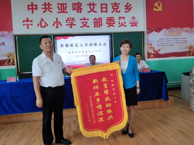 孙秀玲在讲话中说,自2021年3月起,学校开启助力亚喀艾日克乡教育教学工作,学校党委充分依托学校教育优势,在帮扶内容、帮扶机制上做好顶层设计,把对亚乡小学的帮扶作为“访惠聚”工作的重要任务,通过派驻经验丰富的管理干部、骨干教师和实习支教学生,充实优化教师队伍,提升办学水平;通过开展“双师课堂”,创新教学模式,安装专网并购置平板电脑,做好教学保障工作;开展假期“小课堂”、组织夏令营活动等,提高亚乡小学教育教学质量;制定《中华优秀传统文化进校园实施方案》,深入推进文化润疆工作落实落小,铸牢中华民族共同体意识,已初步形成“日常教学+周末小课堂+假期小课堂+夏令营”的教育帮扶模式。为改变亚乡小学办学条件和学习条件,学校用全体党员捐款形成的“初心基金”连续两年向亚乡小学捐赠包括图书、教学设备等,充分体现了新疆师大党委和全体教职工们对亚乡孩子们的关心关爱,也是师大人教育情怀和社会责任的具体体现。