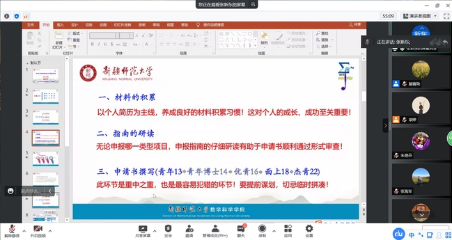 为提高太阳成官网2022年第二批自治区自然科学基金项目申报质量,7月6日下午,科研处邀请数学科学学院教授张新东,以腾讯会议形式举办了自治区自然科学基金项目申报培训讲座。讲座由科研处副处长颜赛勋主持,理工科学院申报项目教师、青年学术骨干、科研秘书和科研处工作人员共140余人参会。