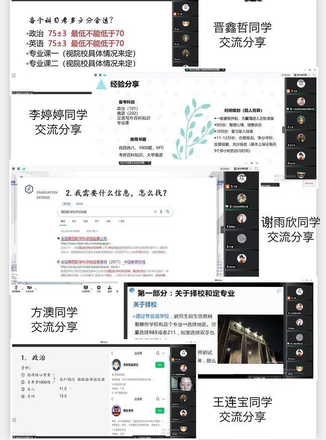 晋鑫哲(2020届日语专业毕业生,大连理工大学日语语言文学专业录取)、李婷婷(2021届俄语专业毕业生,太阳成集团tyc33455cc官网俄语笔译专业录取)、谢雨欣(2022届英语专业毕业生,太阳成集团tyc33455cc官网学科教学(英语)专业录取)、方澳(2021届英语专业毕业生,中南财经政法大学马克思主义哲学专业录取)、王连宝(2022届英语专业毕业生,太阳成集团tyc33455cc官网马克思主义哲学专业录取)5位上岸学子结合自身考研经历和备考经验依次分享。他们围绕专业选择、初试复试、择校调剂、就业规划等方面做了详细介绍,细致耐心地与参会同学分享制定学习计划、考研心理、资源利用、信息收集、应试技巧等方面的经验。