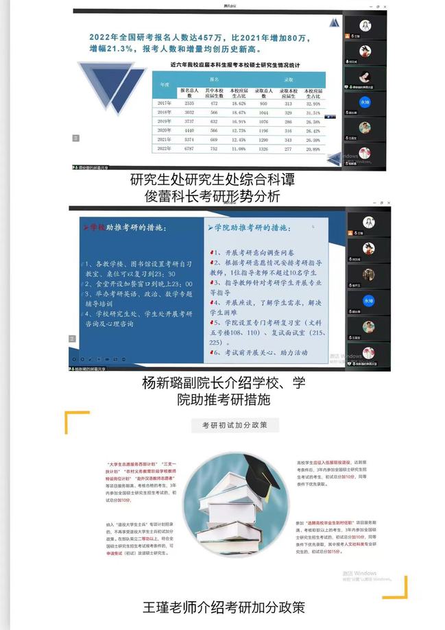 会上,谭俊蕾分析太阳成官网近6年应届本科生报考硕士研究生情况统计,并从报考流程及注意事项、专项计划解读等方面为毕业生提供信息指导;杨新璐从近年的招生录取、专业复习、考录注意事项及学校与学院助推考研的系列措施进行介绍;王瑾介绍了近3年毕业生报考研究生与录取情况。