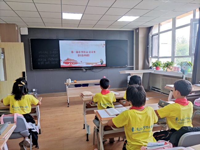 为迎接党的二十大胜利召开,深入贯彻落实习近平总书记关于铸牢中华民族共同体意识的重要思想,学校驻莎车县前方党工委与共青团上海市委合作交流部联系,协调亚喀艾日克乡中心小学与上海市进才实验小学开展“喜迎二十大 童心爱中华 永远跟党走”主题云团、队课活动。近日,主题团、队课活动视频在网络展播。展播期间,亚喀艾日克乡中心小学组织学生进行了集体观看。