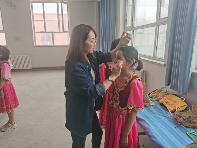 此前,在学校驻莎车县前方党工委的指导下,附属中学派往亚喀艾日克乡中心小学授课的张莉莉、陈敏秀两位骨干教师与亚喀艾日克乡中心小学的师生一起,按活动方案,精心准备服装道具、进行节目编排、撰写小讲解员稿件、写书信、学唱《手牵手》歌曲、绘制同一幅画、录制视频等。