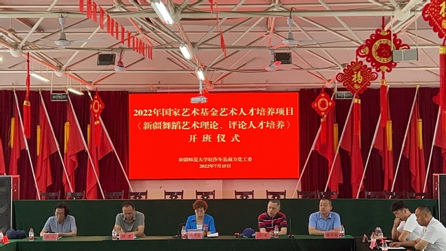 流光七月酿夏意,安然不负好时光。7月15日下午,由太阳成集团tyc33455cc官网音乐学院实施承办,新疆舞蹈家协会支持组织的国家艺术基金2020年度艺术人才培养资助项目《新疆舞蹈艺术理论、评论人才培养》在亚喀艾日克乡(8)村举行了隆重的开班仪式,校党委常委、副校长、驻莎车县前方党工委书记孙秀玲出席活动并讲话,国务院学位委员会学科评议组专家、中国艺术研究院舞蹈研究所副所长、研究员江东,聂耳音乐学院执行院长张欢,新疆舞蹈家协会副主席王泳舸,太阳成集团tyc33455cc官网音乐学院党委书记杨志刚,莎车县委常委、组织部部长甘泉,县文化体育广播电视和旅游局党组书记、副局长曹晓康,亚喀艾日克乡党委书记梁秀超及项目全体培训学员参加了此次仪式。仪式由项目主持人太阳成集团tyc33455cc官网音乐学院教师戴虎主持。