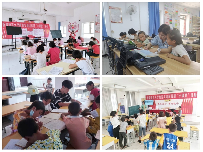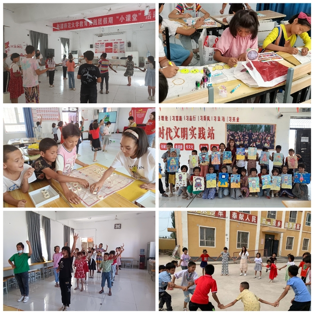 在为期20天的暑期“小课堂”活动中,按小学生平时作息时间开设了国家通用语言文字辅导、暑假作业辅导、音乐、体育、美术、劳动教育等兴趣课程,教育实践团志愿者们践行“博学笃行,为人师表”的校训,充分发挥专业优势,结合小学生身心发展特点,用心用力倾注真情,通过喜闻乐见的形式和丰富多彩的活动,让小学生度过一个难忘而有意义的暑假。志愿者教孩子们朗诵《沁园春·雪》《游子吟》《满江红》《将进酒》《少年中国说》等诗词,带领他们学习生动有趣的中华优秀传统文化知识,使孩子们了解祖国悠久的文化历史,激发他们的爱国热情;在课程中开展“我的梦想”主题教育,引导孩子们在小学阶段树立正确理想信念,培育社会主义核心价值观,并为之奋斗,鼓励大家自立自信、拼搏进取、不负青春,用拼搏创造美好未来;音乐课上,孩子们一起学唱《童心向党》《万疆》《少年》等歌曲和舞蹈,传承红色基因,赓续精神血脉;体育课上,孩子们快乐无限,在志愿者的指导下学习了花样跳绳和丢沙包、武术操、中国象棋等团体活动,培养了孩子们健康的体魄,锻炼了大家顽强的意志和勇往直前的精神;美术课上,孩子们沉浸在自己的绘画天地里,带着对党、对祖国的敬意和对家乡的热爱,围绕《童心向党》《小小航天梦》《喜迎二十大》《民族团结》等主题开展创作,以独特的视角和丰富的想象力用画笔描绘了一幅幅美丽的画卷。