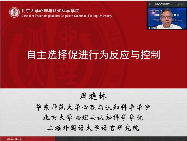 在学术年会特邀报告环节,华东师范大学心理与认知科学学院周晓林教授作题为《自主选择促进行为反应与控制》的报告。报告从研究背景、自主选择促进行为与控制、结论三个方面进行,用13个行为实验探究了自主选择对行为的影响,回答了自主选择影响个体行为表现的方式、相应认知加工的具体层次以及制约因素。北京大学心理与认知科学学院吴艳红教授以《中国人谦虚人格的社会认知机制》为题进行了分享。她从谦虚人格的社会认知特征出发,探讨了他人对谦虚者的印象以及谦虚者的自我印象,阐明了谦虚人格对心理健康产生的影响机制及谦虚影响社会交往的认知神经机制。