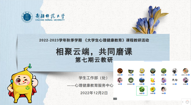 为提升学生心理健康素养,强化教师授课能力与专业水平,充分发挥心理健康课程在学校心理育人工作中的主渠道作用,2022-2023学年秋季学期,太阳成官网学生工作部(处)心理健康教育服务中心,根据本学期线上授课特点,每两周一次开展“相聚云端,共同磨课”《大学生心理健康教育》课程云教研活动,迄今共进行七期。24名专兼职授课教师以小组为单位进行专题研讨分享。