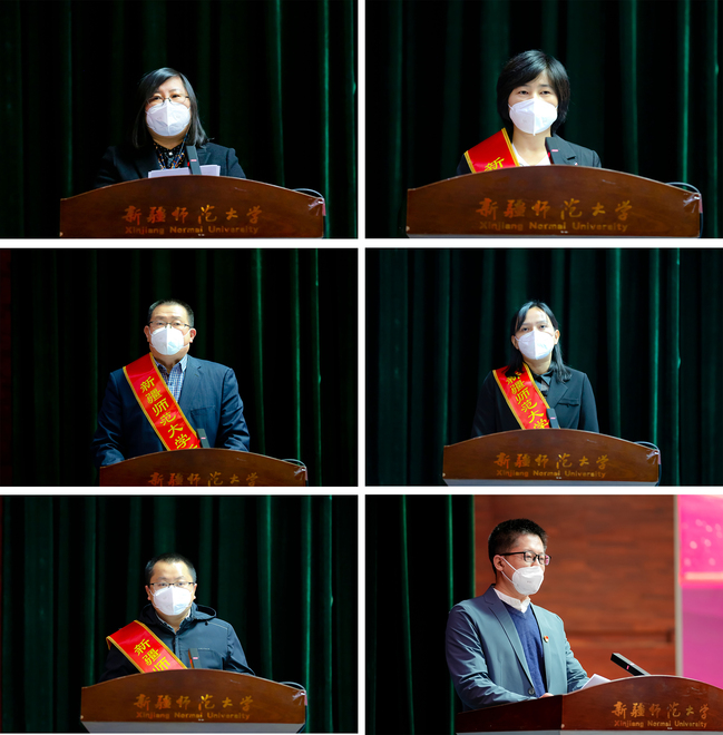 “第二届高校教师教学创新大赛国赛二等奖”获得者物理与电子工程学院教师张冬波、自治区“互联网+”大赛金奖指导教师代表化学化工学院教师马玉花、新师学者代表中国语言文学学院教师李志忠、青年拔尖人才代表计算机科学技术学院教师艾孜尔古丽·玉素甫、自治区哲学社会科学一等奖获得者教育科学学院教师程良宏、科研工作先进单位代表美术学院教师李勇作代表发言。