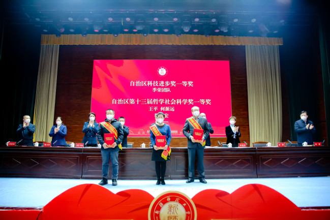 为自治区科技进步奖一等奖、自治区第十三届哲学社会科学成果奖一等奖获得者颁奖