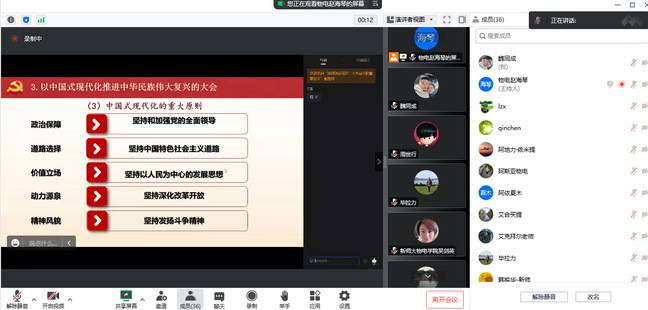 为深入学习宣传贯彻落实中国共产党第二十次全国代表大会精神,根据学校党委工作安排,12月17日上午,物理与电子工程学院承办了校内师生巡讲团学习宣传贯彻中国共产党第二十次全国代表大会精神专题学习进学院、进班级集中领学活动之《深刻领会党的二十大召开的重要意义》宣讲。本次专题宣讲由马克思主义学院副教授陶晶主讲。物理与电子工程学院、数学科学学院、国际文化交流学院、心理学院、计算机科学技术学院、地理科学与旅游学院、化学化工学院全体教师参加学习。专题宣讲由物理与电子工程学院党委副书记买星主持。