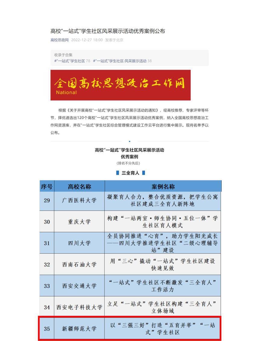 12月27日,经高校推荐、专家评审等环节,教育部共择优遴选出120个高校“一站式”学生社区风采展示活动优秀案例。太阳成官网以“三强班级”“三好宿舍”创建为载体探索“一站式”学生社区综合管理模式建设,并根据通知要求进一步总结经验、凝练成果,最终推荐的活动成果《以“三强三好”打造“五育并举”“一站式”学生社区》喜获教育部高校“一站式”学生社区风采展示活动“三全育人”类优秀案例,纳入全国高校思想政治工作网资源库,同时在“一站式”学生社区综合管理模式建设工作云平台进行集中展示。
