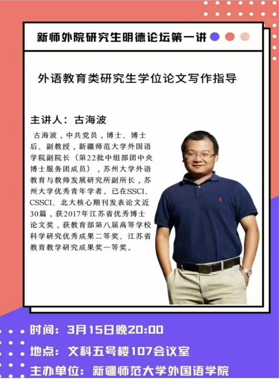 古海波对于教学和人才培养特别“倾心”,不仅自己给新疆师大外语的本科生和研究生上课,还积极发动他的苏大外国语学院领导和同事们、国内研究同行和江浙地区中小学研究型教师朋友们一起投身于教育援疆工作,组建了一个“外语援疆共同体”,在师大外国语学院开展了多项活动。