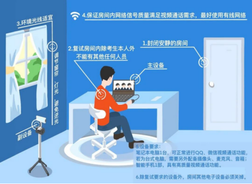 考生在模拟面试前,务必将用于复试的网络设备和环境准备好,收到学院模拟面试通知后,应提前与学院进行网络远程复试模拟测试。