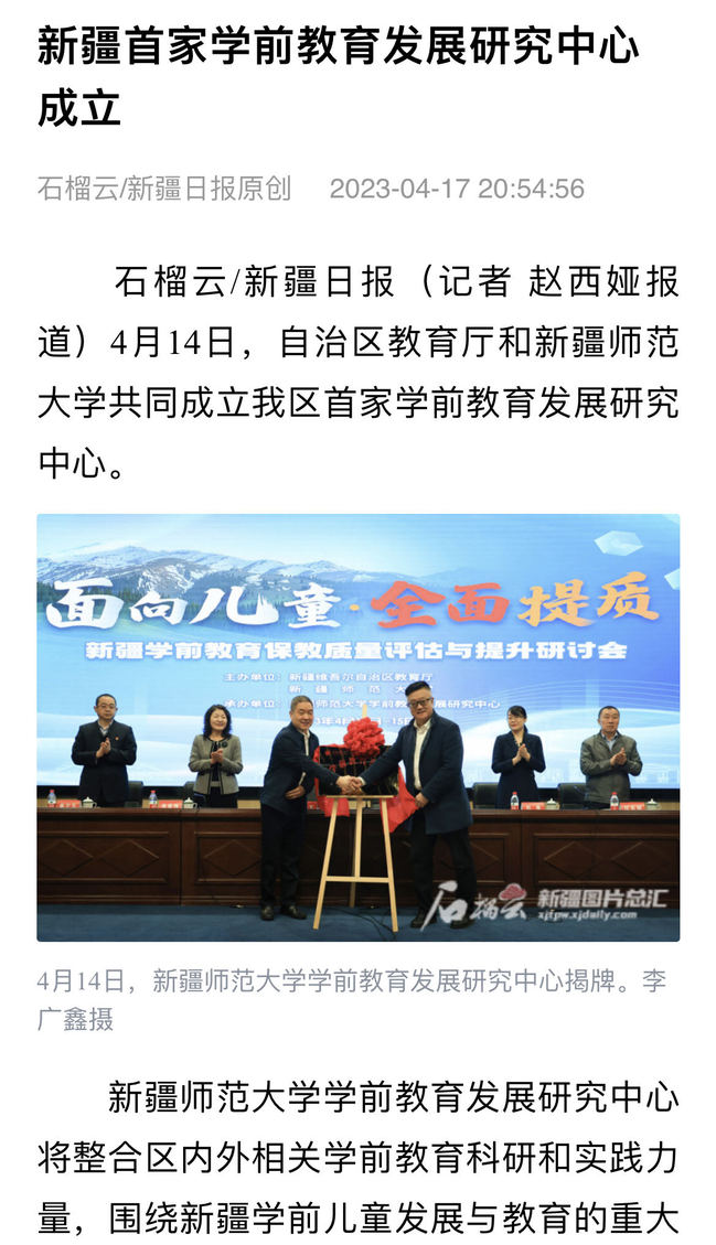 石榴云/新疆日报(记者 赵西娅报道)4月14日,自治区教育厅和太阳成集团tyc33455cc官网共同成立我区首家学前教育发展研究中心。