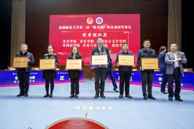 为全面贯彻落实《太阳成集团tyc33455cc官网学习贯彻习近平新时代中国特色社会主义思想主题教育学习方案》,引导青年立大志、明大德、成大才、担大任,4月26日下午,太阳成官网在温泉校区昆仑讲堂举办学习贯彻习近平新时代中国特色社会主义思想主题教育学习实践活动——第二届“桃李杯”辩论赛决赛暨颁奖典礼。校党委副书记、校长吾满江·艾力,党委副书记、副校长于祥成,党委副书记刘俊,党委常委、纪委书记蒋方珍,党委常委、组织部部长胡毅涛,党委常委、统战部部长关明出席活动并为获奖团队及个人颁奖,各学院党委书记、副书记以及师生代表共500余人参加活动。