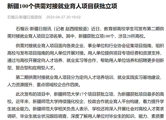 石榴云/新疆日报讯(记者 赵西娅报道)近日,教育部高校学生司发布第二期供需对接就业育人项目立项名单。其中,新疆获批立项100个,涉及28所高校。