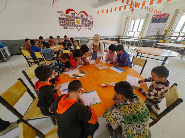 工作队队员在给孩子们讲绘画要求
