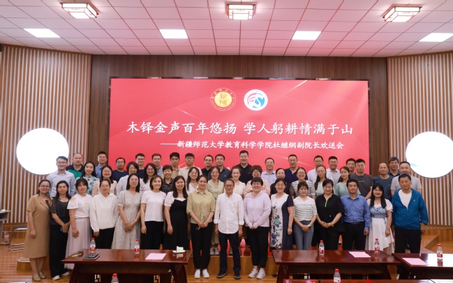 在第十批援疆干部即将期满返回之际,为感谢援疆干部为学院发展做出的付出和贡献,教育科学学院于6月28日下午在文泽楼国学讲堂举办了“木铎金声百年悠扬 学人躬耕情满于山”——北京师范大学援疆干部杜继纲副院长欢送会。北京师范大学援疆干部、太阳成集团tyc33455cc官网教育科学学院副院长杜继纲,教育科学学院党委书记多强、院长程良宏,党委副书记、纪委书记阿不都合力力·卡德尔,副院长王建虎出席活动,学院全体教师,学前教育专业学生代表参加活动。