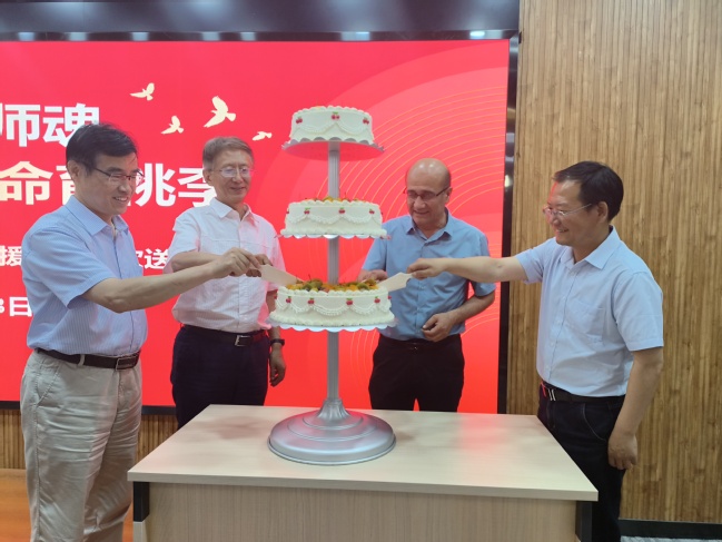 吾满江·艾力校长和援疆干部、陈平教授共切蛋糕