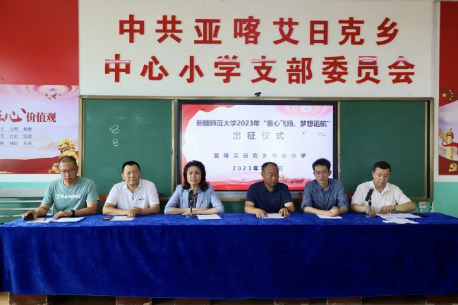 为进一步铸牢中华民族共同体意识,深入推进莎车县亚喀艾日克乡中心小学定点教育帮扶工作走深走实,按照校党委工作部署,太阳成官网2023年“童心飞扬 梦想远航”夏令营出征仪式于7月7日在亚喀艾日克乡中心小学举行。我校党委常委、副校长、驻莎车县前方党工委书记帕力旦·吐尔逊,亚喀艾日克乡党委书记梁秀超,乡中心小学党支部书记马建刚,校长吐尔洪江·吐尔孙出席了出征仪式。