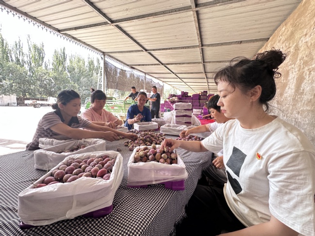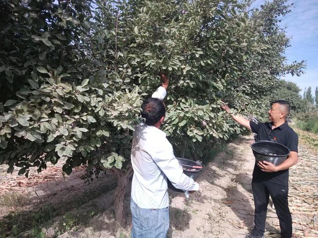 工作队和农民一起采摘、分拣、过秤、装箱,“西梅的管护、采收都需要大量的劳动力,这也为村民提供了务工的机会。工作队一定要带领全村通过‘甜蜜产业’走上致富路!”工作队副队长卢修配带领工作队员深入田间地头助农采收,大家干得热火朝天,呈现出一派喜人的丰收场景。“今年西梅长得比去年好,产量大,如果不及时采摘的话,会造成很大的经济损失,目前在工作队的帮助下,采摘完就可以出售了,我有信心今年收入更高!”西梅种植户萨塔尔·艾买尔开心地说。