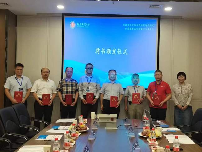 会上,首先由实验室主任艾尔肯·斯地克教授作工作汇报,他从实验室的发展历程、目标定位、团队建设、研究方向、成果产出等方面进行了详细阐述,重点围绕实验室建设面临的困难以及下一步工作计划和思路做了说明。随后,学术委员会成员们围绕提升实验室建设水平、加大科研成果转化力度、助力新疆“八大产业集群”新材料领域发展等方面进行了讨论并提出意见建议。新疆大学贾殿增教授、美国南佐治亚大学王笑军教授、东北师范大学张昕彤教授、华南理工大学夏志国教授等16位专家逐一发言,他们建议重点实验室建设要着眼长远、认真谋划、主动作为,以需求为导向,在突出特色的基础上不断拓展研究方向,要将实验室建设与实际应用结合起来,加强实验室条件建设和人才队伍建设,加强学术交流与合作,在矿产资源开发利用等方面谋求合作,同时以评估验收指标体系为参考,推动实验室建设和发展。物理与电子工程学院党委副书记、院长向梅对与会专家的精心指导表达了感谢,并表示将充分吸收、借鉴和践行学术委员会提出的建设性意见,努力推动实验室的发展。会议最后,物理与电子工程学院党委书记李莉代表学院向学术委员会成员颁发了荣誉聘书。