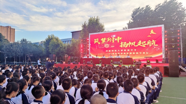 四时俱可喜,最好新秋时。8月27日下午,附属中学隆重举行2023-2024学年开学典礼暨庆祝教师节活动,附属中学领导、全体教职工、全国教育广播电视融媒体中心人员、家长代表及4000余名中学部学生参加活动。校党委书记吕志新出席并致辞,活动由校党委副书记、校长杨艳主持。