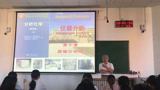 此外,刘虎威教授还来到本科生课堂,为化学21-1班、21-2班开展了《仪器分析》课程中的质谱分析、色谱分析法导论部分授课,为2023级化学专业研究生讲授了高等分析化学中气相色谱、高效液相色谱法的基础理论、应用及前沿发展趋势。刘虎威结合课程内容,对学生提出了发展中国科技,提高中国相关仪器技术水平的期待。