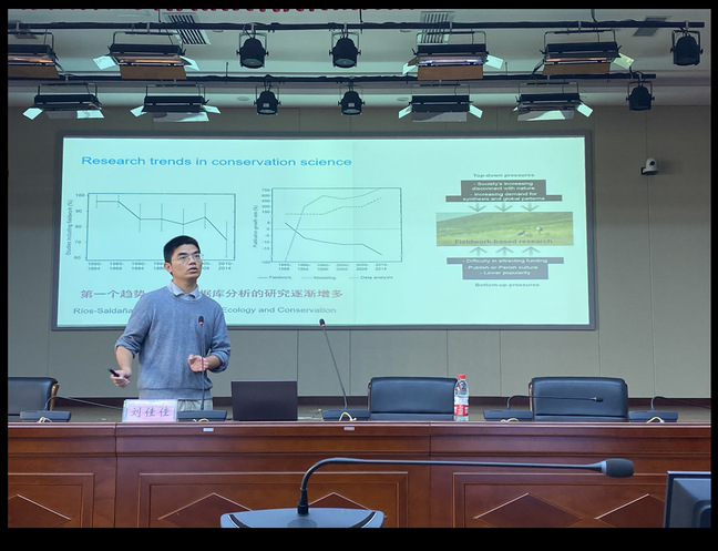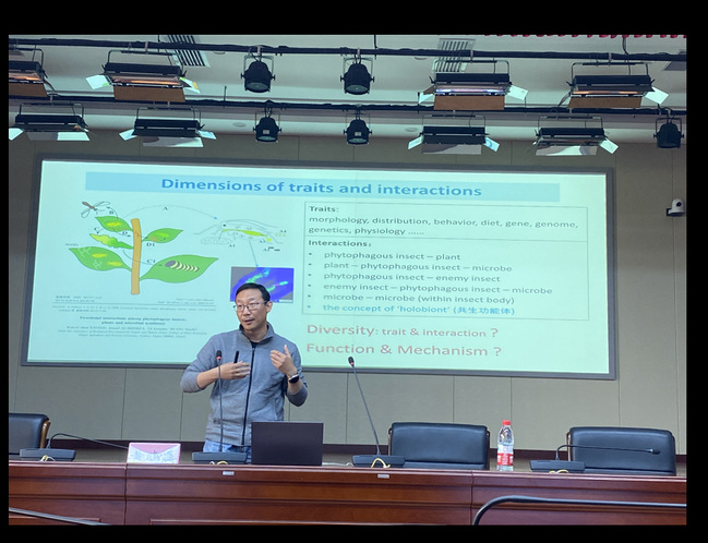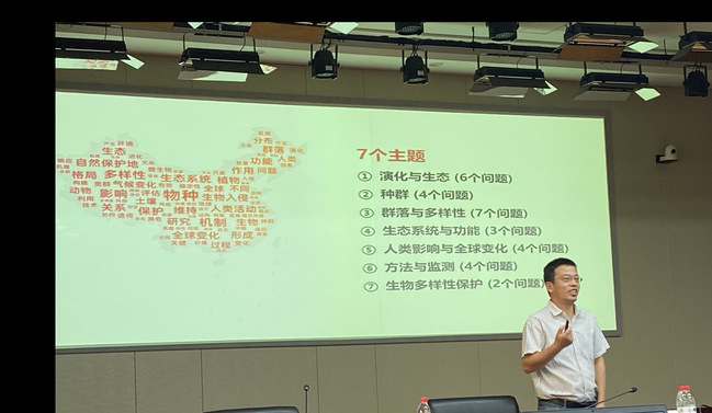 张健在报告中介绍了生物多样性研究的发展历程,解释了中国生物多样性研究的30个核心问题。黄晓磊介绍了如何利用多组学数据研究昆虫和植物等物种间关系。刘佳佳介绍了如何利用数据库探索全球生物多样性变化规律。苏志豪以濒危植物“半日花”为例,介绍了荒漠珍稀濒危植物小居群的进化与遗传效应。董正武介绍了荒漠植物水分利用的生态适应机制。
