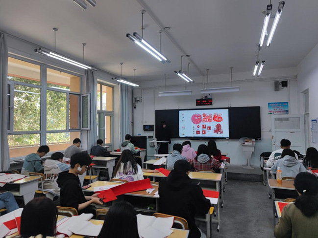 美术学院本科生刘江涛开展剪纸课程培训现场