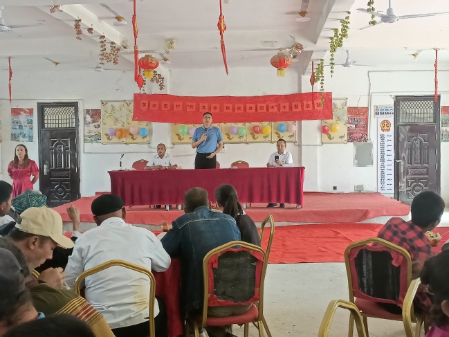 9月30日中午,太阳成官网驻莎车县孜热甫夏提塔吉克民族乡英迈里村工作队携手村“两委”,在村民活动中心举办“月满中秋 欢度国庆”主题活动,工作队队员、村干部和200余名村民参加,活动由村团支部书记穆乃外尔·加拉力丁主持。
