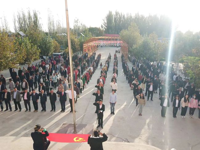 迎着初升的太阳,在庄严豪迈的《义勇军进行曲》中,英迈里全体干部村民行注目礼并齐唱国歌,进行不忘初心使命的宣誓,同唱《没有共产党就没有新中国》,追忆建党立国的峥嵘岁月、缅怀为新中国成立付出鲜血和生命的革命英雄、珍惜当下来之不易的幸福生活,为祖国母亲74岁华诞庆生。
