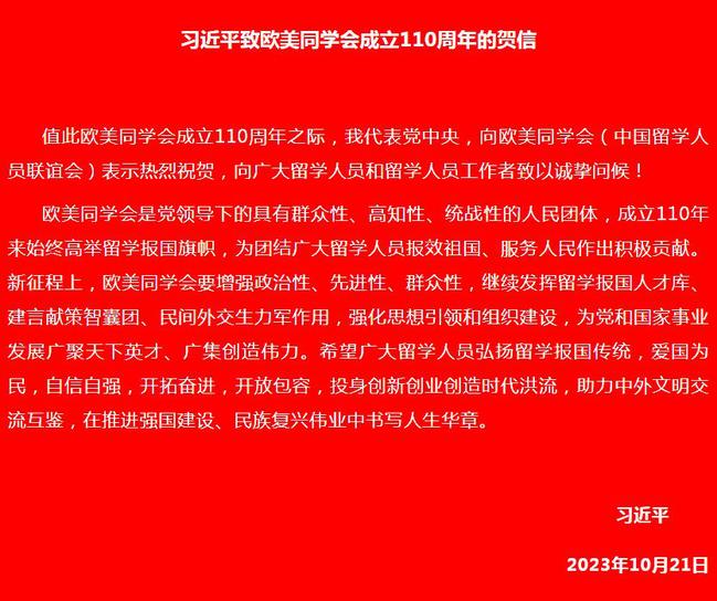 在欧美同学会成立110周年之际,中共中央总书记、国家主席、中央军委主席习近平发来贺信,代表党中央向欧美同学会(中国留学人员联谊会)表示热烈祝贺,向广大留学人员和留学人员工作者致以诚挚问候。欧美同学会成立110周年庆祝大会21日在京举行。中共中央政治局常委、全国政协主席王沪宁出席并讲话。