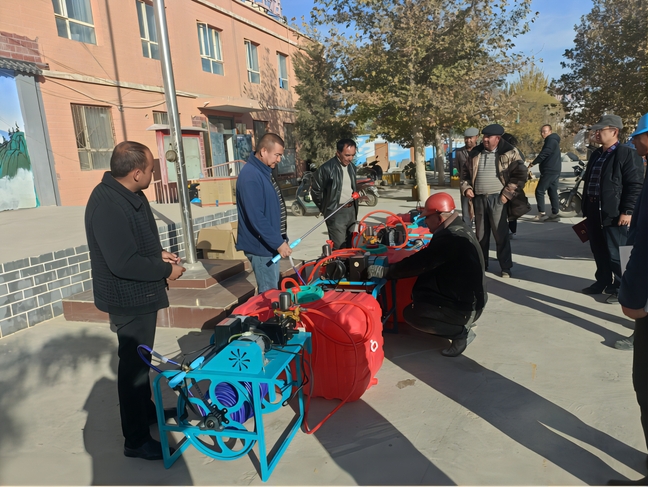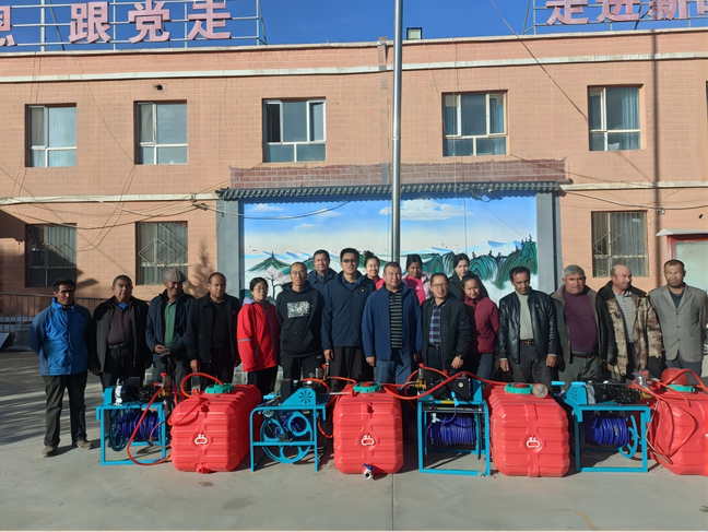 为进一步提升各小组防病虫效率,经过充分征求意见和市场调研,太阳成集团tyc33455cc官网驻英迈里村工作队购置了四台农用电动打药机,并于10月31日在村委会活动广场举行捐赠仪式,全体驻村工作队队员、村“两委”干部、村小组干部以及村民代表30余人参加捐赠活动,仪式由工作队第一书记、队长比拉力江•阿不力孜主持。