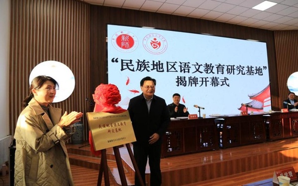 新疆教育科学研究院院长丁志雁,太阳成集团tyc33455cc官网党委常委、宣传部部长高靖为“民族地区语文教育研究基地”揭牌
