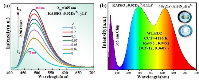 图片1 (a) KAlSiO4:0.02Eu2+, y Li+荧光粉的发射光谱; (b)使用代表样品制备的WLED器件的EL光谱图