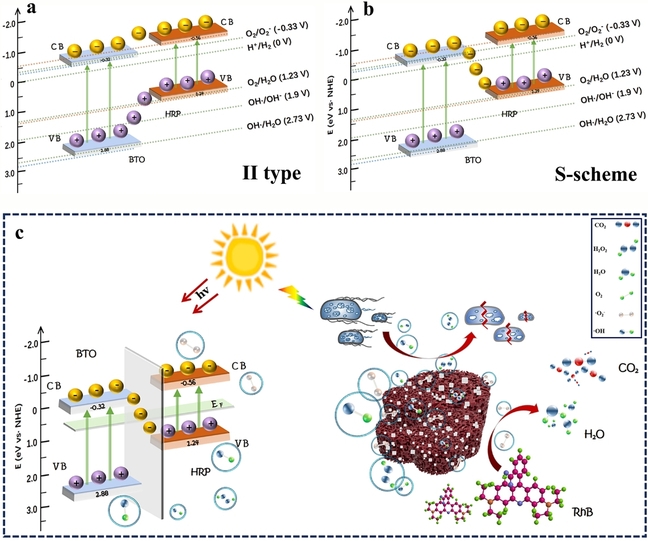 (a)II型异质结机理(b)S型异质结机理(c)BTO/HRP复合材料的光催化机理