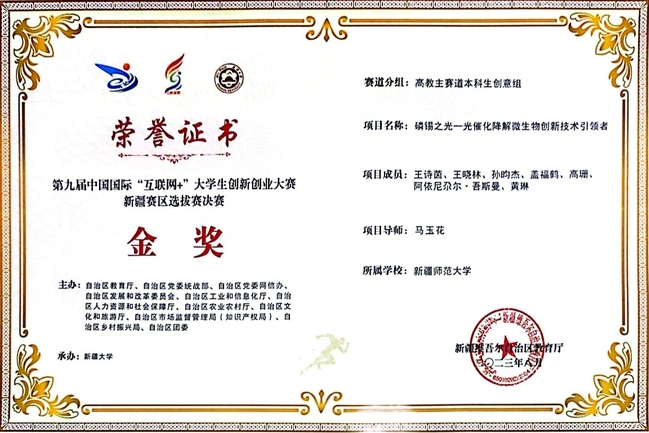 该团队申请获得了自治区级大学生创新创业训练项目(NO. 20201701141126),所建立的《磷锡之光—光催化降解微生物创新技术引领者》项目在第九届互联网+大学生创新创业大赛中荣获自治区金奖。