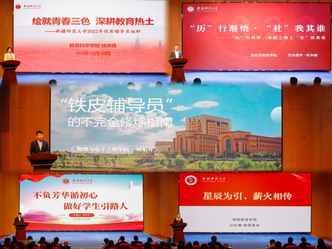 此次辅导员述职会由校党委组织部、宣传部、团委、研究生处、大学生就业指导中心、后勤服务中心、学生工作部(处)等相关职能部门负责同志担任评委,从德、能、勤、绩、廉五个方面对辅导员工作完成情况进行全方位评价。23名优秀辅导员候选人围绕九大工作职责,全面展示了过去一年的工作成效、典型经验以及在学生工作中的收获、感悟与成长,并对工作中的不足作了反思总结。