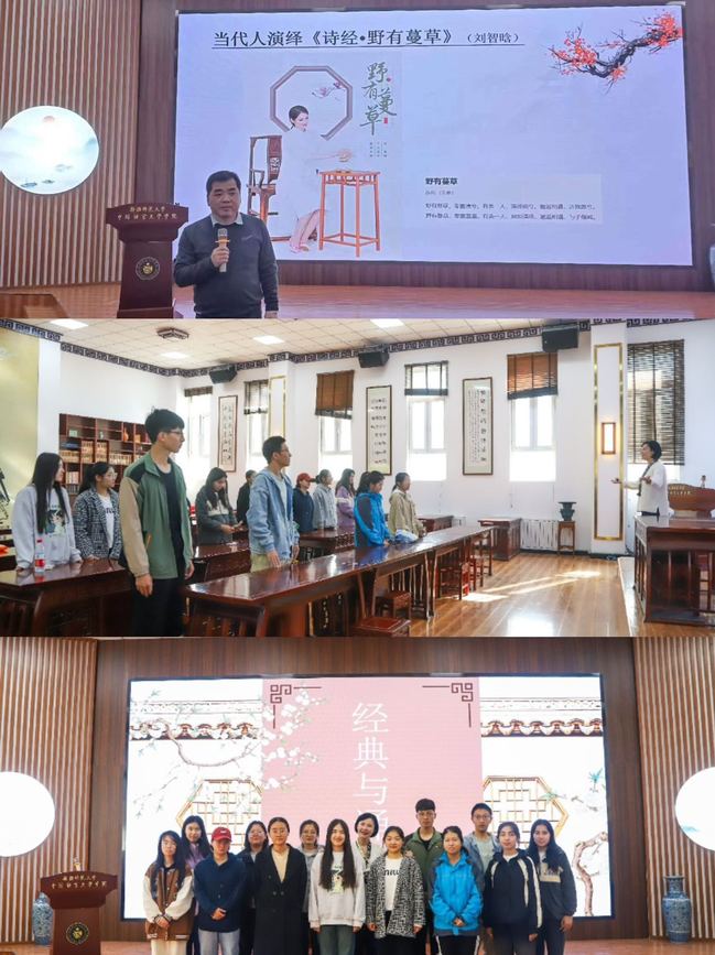 中国语言文学学院国学文化教研室开设《中华经典诵读》课。通过诵、背、书、唱、演等形式普及推广国家通用语言,营造经典诗文诵读氛围,将传统诗词、经典哲学与语言课堂紧密结合,把中华文化经典渗透到校园生活之中,渗透到学科教学之中,提升学生的审美修养,丰厚学生的人文底蕴,传承中华传统美德,培养崇尚文明礼仪。