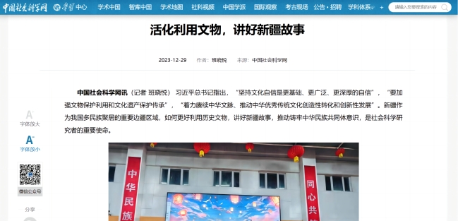 中国社会科学网讯(记者班晓悦)习近平总书记指出,“坚持文化自信是更基础、更广泛、更深厚的自信”,“要加强文物保护利用和文化遗产保护传承”,“着力赓续中华文脉、推动中华优秀传统文化创造性转化和创新性发展”。新疆作为我国多民族聚居的重要边疆区域,如何更好利用历史文物,讲好新疆故事,推动铸牢中华民族共同体意识,是社会科学研究者的重要使命。