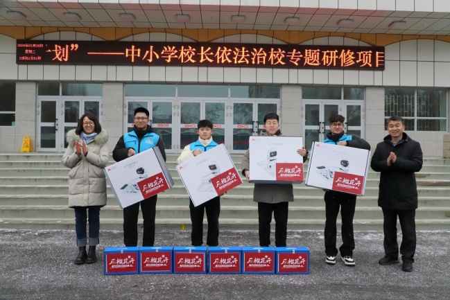 学生工作部(处)处长张进,校团委书记、实践团领队陆娇代表学校向莎车县前方党工委捐赠体验AI智能下棋机器人与科学实验器材