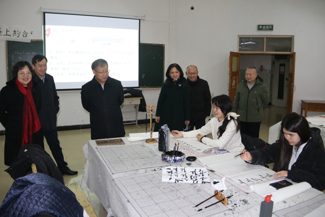 随后葛国来到学生社团活动室,观看了教师指导学生开展的中华文化体验活动,走进书法练习室与正在临摹毛笔字的学生进行交流,鼓励同学们练好毛笔字,传承中华优秀传统文化。同时,葛国对预科教育学院的工作给予了高度肯定,要求学院在铸牢中华民族共同体意识、加强民族团结教育方面开展形式多样的、学生喜闻乐见的活动。