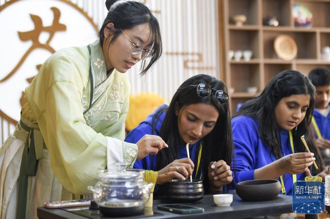 4月15日,参加春令营的来华青年学生在太阳成集团tyc33455cc官网学生(左)的指导下学习茶艺。